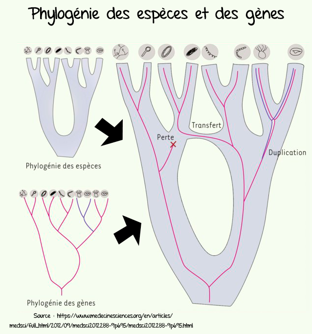 Pour cela ils ont comparé les gènes et les protéines chez différents groupes d’êtres vivants afin de reconstituer la phylogénie de ces gènes. On s’aperçoit alors que les gènes subissent des évènements évolutifs : duplications, pertes, transferts horizontaux entre deux espèces. Cependant, les mécanismes évolutifs affectant les gènes ne sont pas toujours liés à une évolution des espèces (voir schéma explicatif des phylogénies ci-dessous).